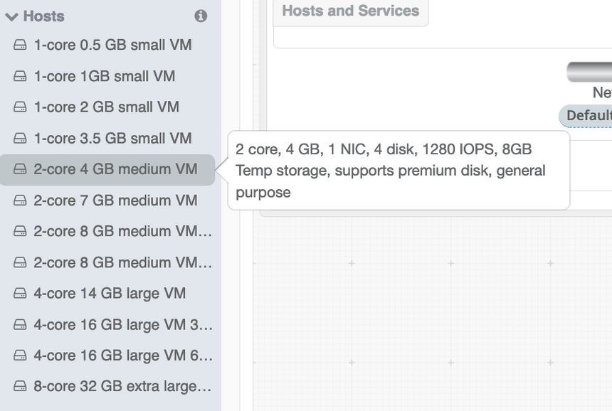 The network structures previously dropped into the tiers have two drop zones named Hosts and services. Anything dropped into the zone associates those components with that network. So, if a set of hosts need to be attached with a fast network but others can be slower, two different network types would be placed on the design and hosts placed accordingly. The faster network technology may be more expensive, so by utilising both, a cost saving may be gained.