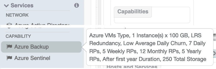An additional box attached to a host (not shown), allows us to associate a capability or a service to a specific host. For example, the allocation of an external or internet IP address or a storage back-up service that has host specific settings.