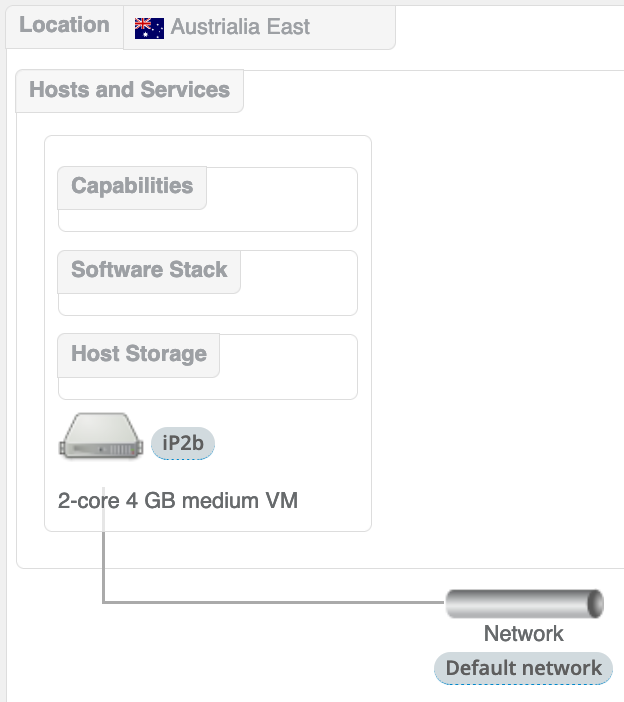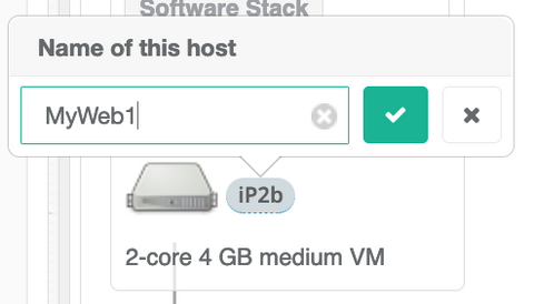 The representation of the host has an icon with its name to the side and a description below. In the example the name is iP2b as an automatically generated name, but this can be renamed to be more intelligible, although they do have to be unique and follow host naming conventions for your infrastructure provider.
