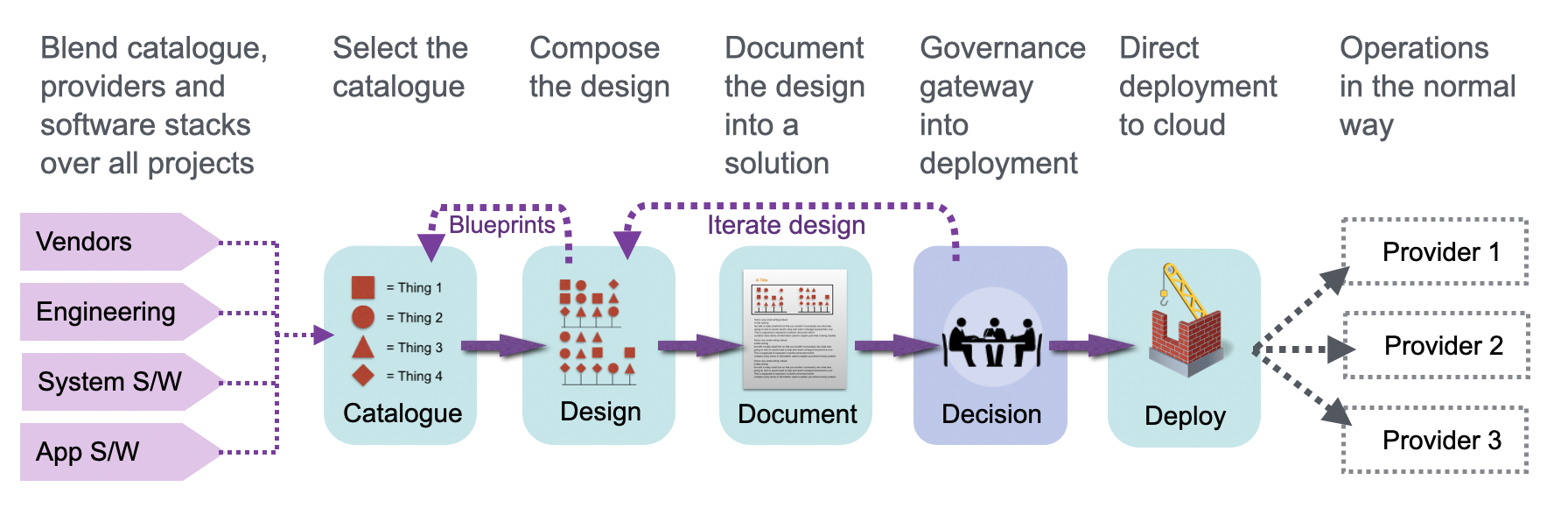 Typically many designs are created using catalogue items. Some have design documentation created, which use the design details to auto-populate parts of the text. Improvements to the design and documentation are iterated until they have reached sufficient quality for deployment.