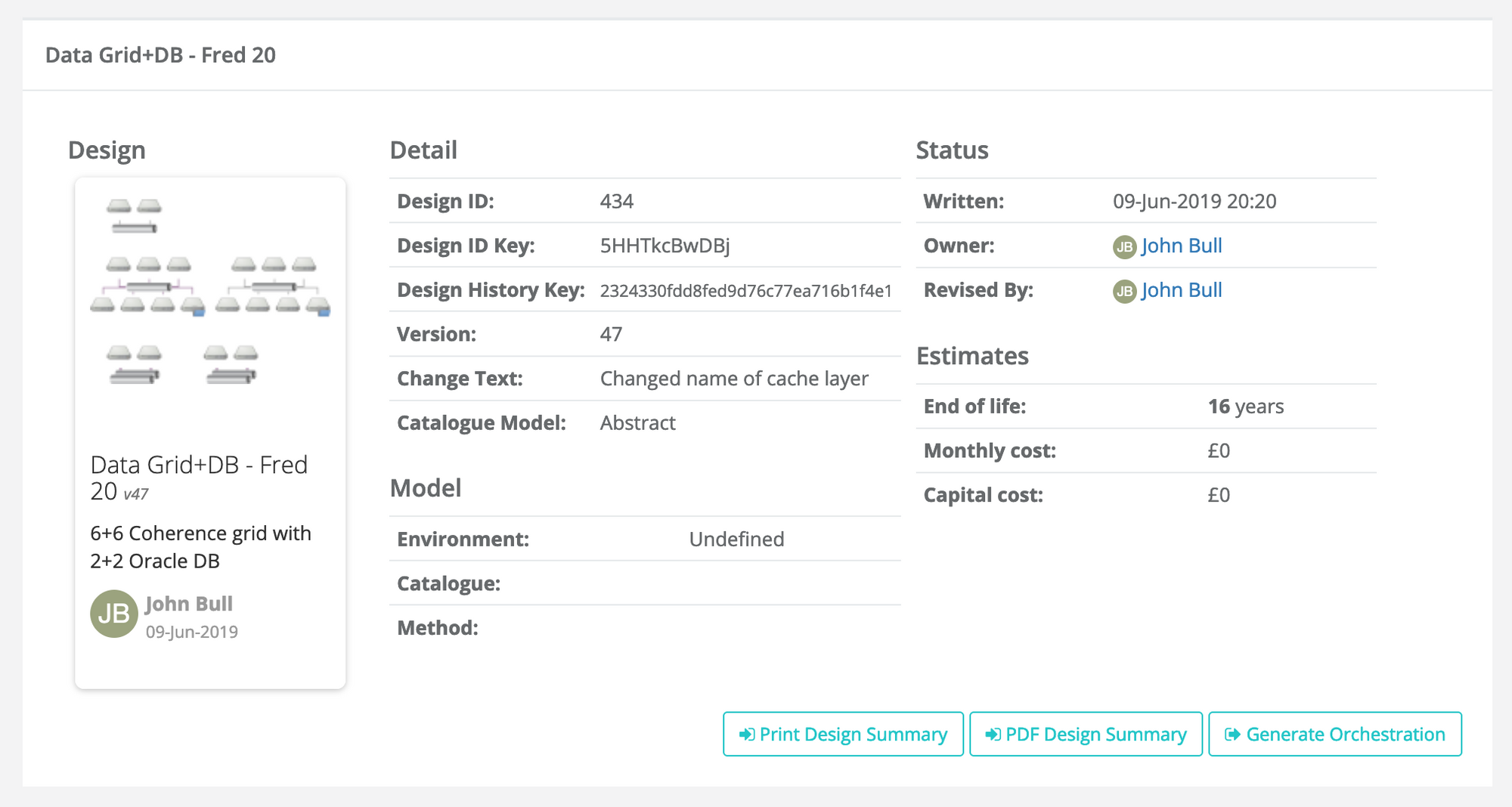 Displays a page that summarises the design on a page with details regarding the design that are similar to the download card (IDs, keys, costs, etc)