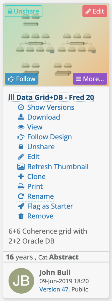 Two buttons over the image include Followand More... to allow the user to follow design changes and to present an expanded range of options. If you have rights to design, there are also Public and Edit buttons that make the design visible to other users and then allow you to make changes. Clicking on the image will draw a read-only view of the design.