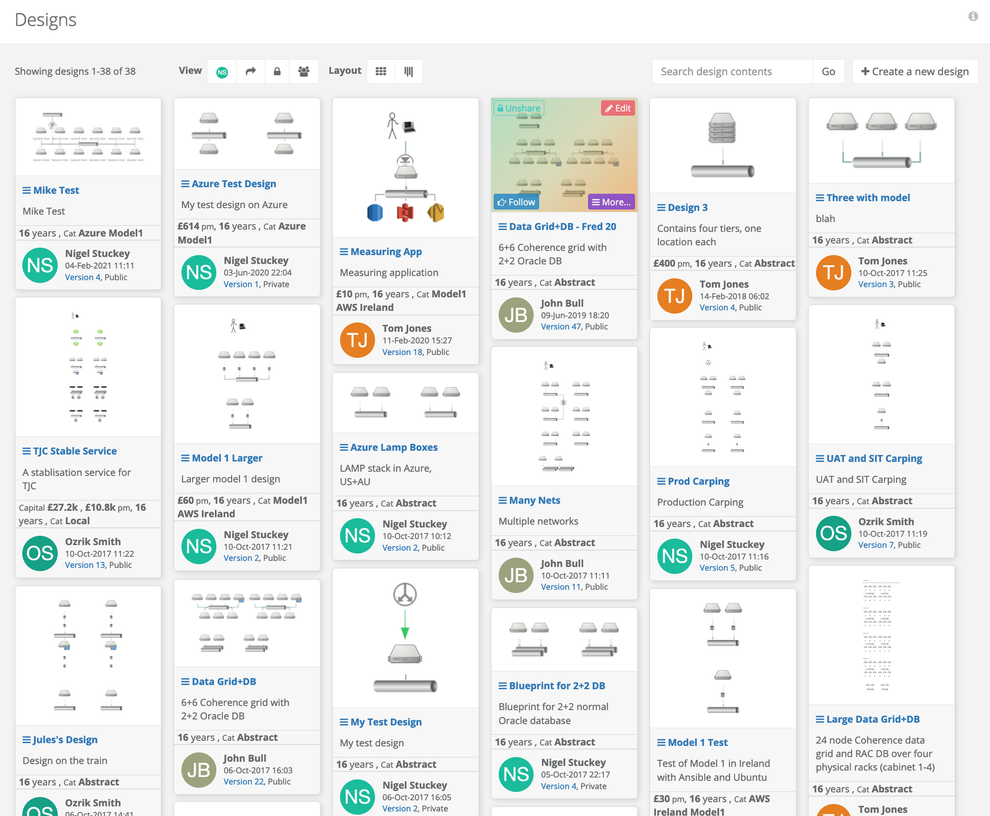 Selecting the design tool or exiting a design editing session, dispays a grid of designs in tiles. The information contained in the tiles include the title, description, cost and a catalogue.