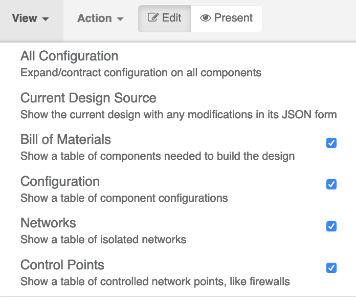 The Edit menu currently only clears the contents of the design. The View menu toggles various information sections below the design canvas (such as Bill of Materials). It also expands the component information areas and shows the current data structure.