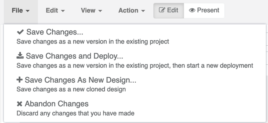 Starting with File, the design can be saved to the same design or a new one, deployed straight away or abandoned, reverting to the previous version.