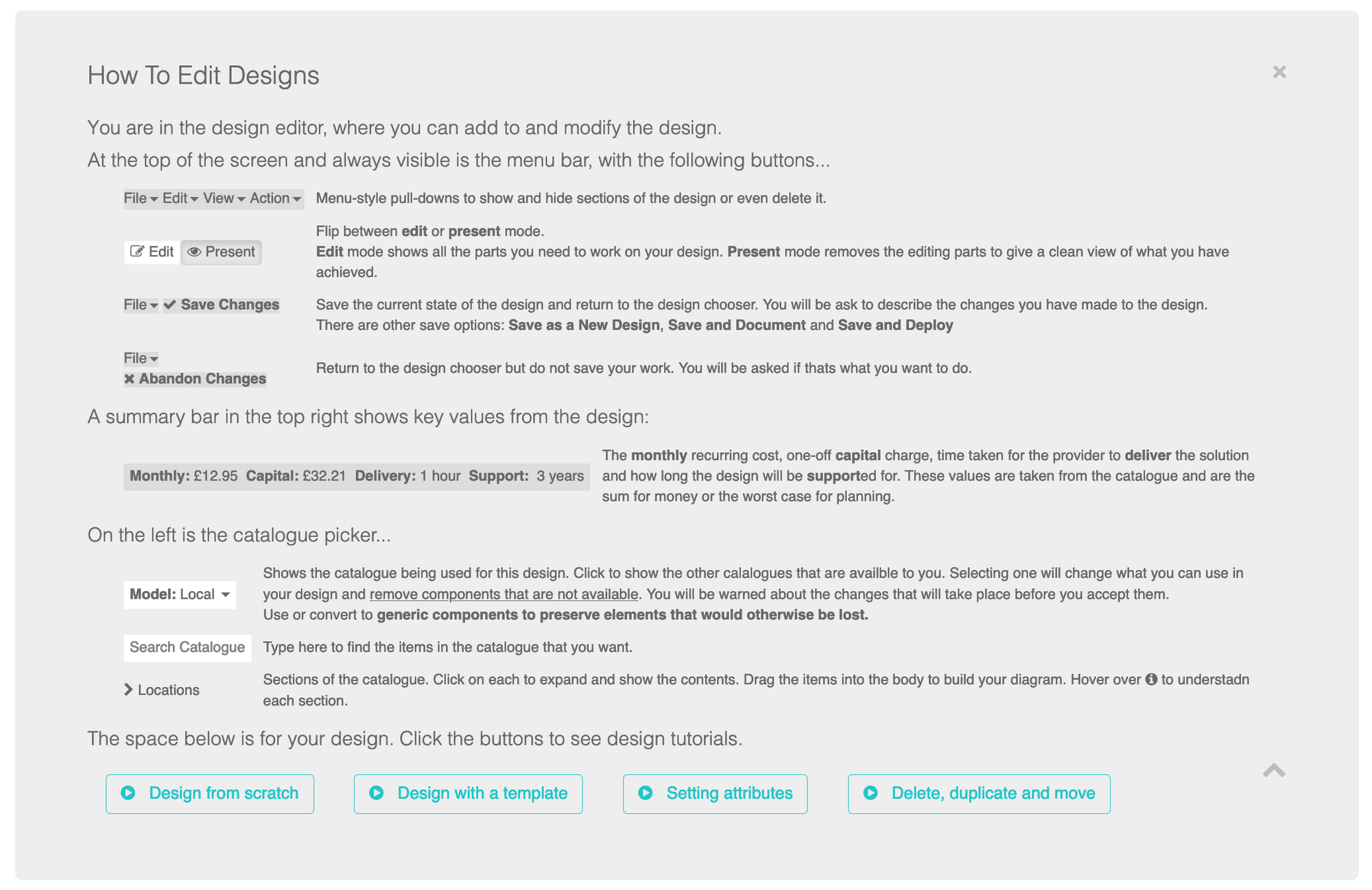 The following describes the design editing tool and the build process of a basic design, showing how it is built up from a blank page.