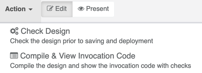 The Action menu carries out tasks against the design. Currently these check the design for correctness and also preview the orchestration code.