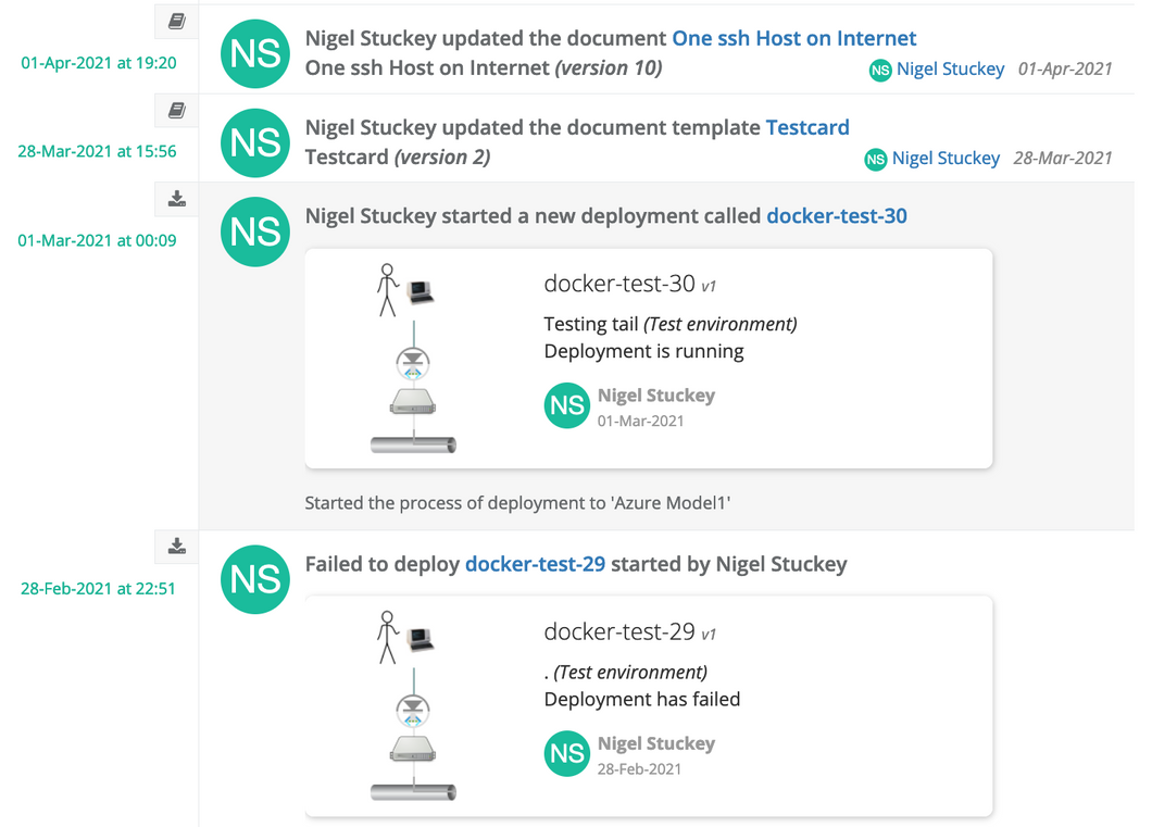 When assets are changed (designs, documents, templates, etc), a deployment is carried out, or an event occurs like a login then these are written to the repository's timeline. This is shared record of the major events (and some minor ones) that have taken place in the system.